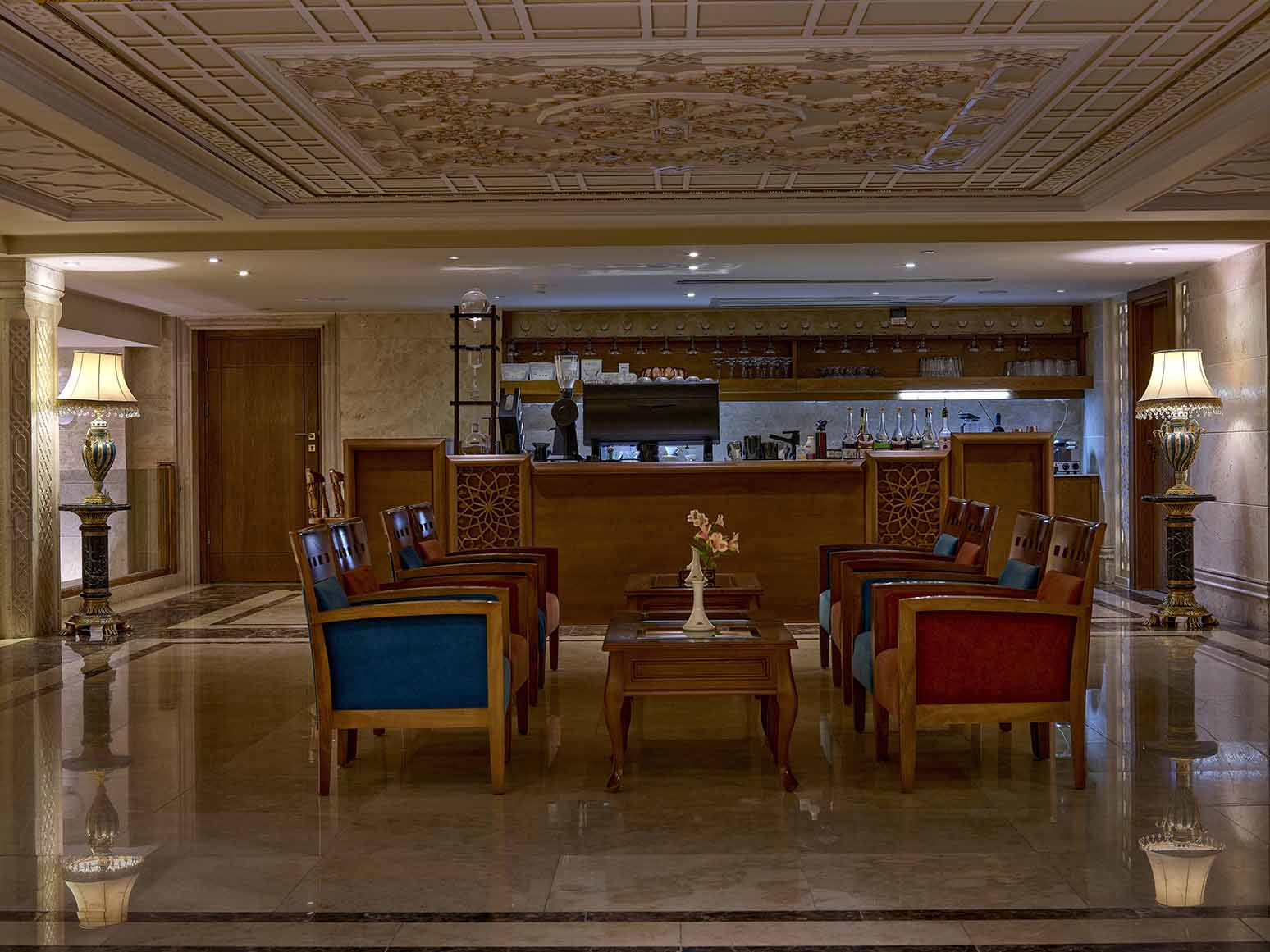 سوئیت مجلل و زیبای زندیه در فضایی بسیار شیک و متفاوت همراه با مبلمان مجلل و دکوراسیون ویژه و بالکن مخصوص آراسته به گل و گیاه و با چشم اندازی بسیار زیبا و بی نظیر از سویی به دروازه قرآن و از سویی دیگر به ارگ زیبای کریمخان می باشد.